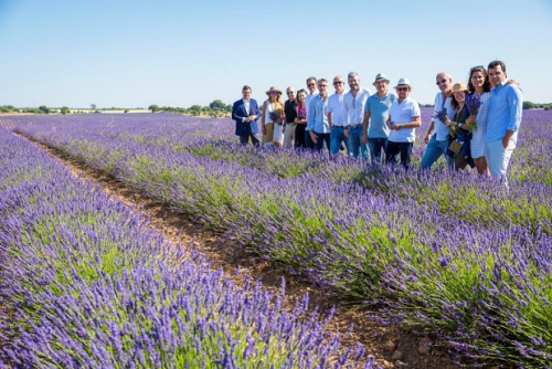 Académicos y patronos de la Fundación Academia del Perfume posan en medio de los campos de lavanda de Brihuega