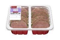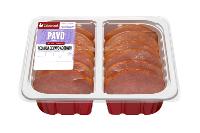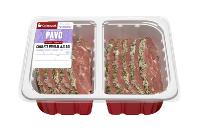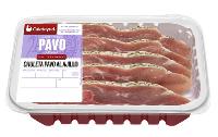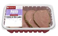 PECHUGA DE PAVO AL AJILLO: Finos filetes de pechuga de pavo aderezados con un agradable sabor ajo y perejil. Formato de libre servicio con peso aproximado de 500 gr y formato bipack de peso aproximado de 2 kg. Su caducidad es de 15 días.