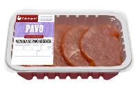 PECHUGA DE PAVO ADOBADA: Finos filetes de pechuga de pavo cubiertos de adobo natural de pimentón. Formato de libre servicio con peso aproximado de 500 gr y formato bipack de peso aproximado de 2 kg. Su caducidad es de 15 días.