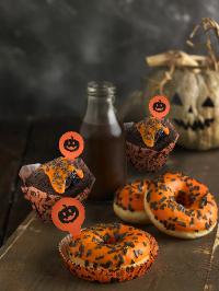 Muffin con masa y relleno de cacao, cobertura de azúcar de color naranja y toppin de virutas de chocolate. Decorado con un pirotino con motivos de Halloween y un pincho con forma de calabaza.