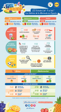 Según el estudio “Lidl – 5 al día” sobre la merienda, los españoles consideran que una merienda completa y equilibrada debe incluir frutas frescas (81%), zumos naturales (64%), lácteos bajos en grasa (59%) y pan integral (53%). Y sólo un 16% considera que debería incluir hortalizas y un 8% pescados en conserva. Sin embargo, aunque el 59% de los españoles cree que merienda de forma sana y equilibrada, sólo un 14% incluye fruta fresca todos los días, un 32% introduce habitualmente lácteos desnatados, un 25% pan o cereales integrales, un 25% embutidos, un 4% hortalizas, un 3% pescado en conserva y un 2% huevos.