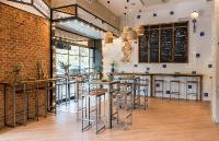 El local, de hormigón armado y ladrillo visto con farolas de muelles pesqueros y cangrejeras recuperadas, tiene un carácter único y auténtico. Las mesas de Atlántico Casa de Petiscos son altas, con taburetes y barras para compartir la experiencia: un mercado gallego creado para vivir y contar, en continuo movimiento.