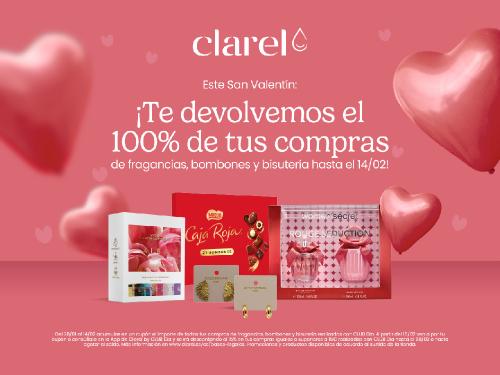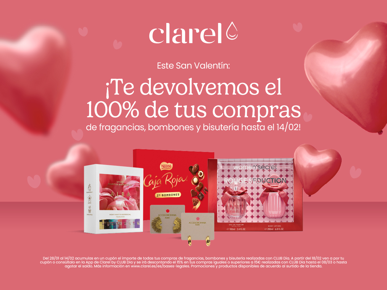 ● Clarel propone un San Valentín centrado en elecciones cotidianas, donde el regalo deja de ser un gesto puntual para convertirse en una experiencia que se prolonga en el tiempo. ● Del 28 de enero al 14 de febrero la marca impulsa una iniciativa en torno a fragancias, bisutería y bombones por la que se devuelve el 100% de las compras iguales o superiores a 15 euros. ● Como parte de la iniciativa Clarel ofrece un 20% de descuento en el catálogo online con el código LOVE26 excluyendo productos ya en promoción