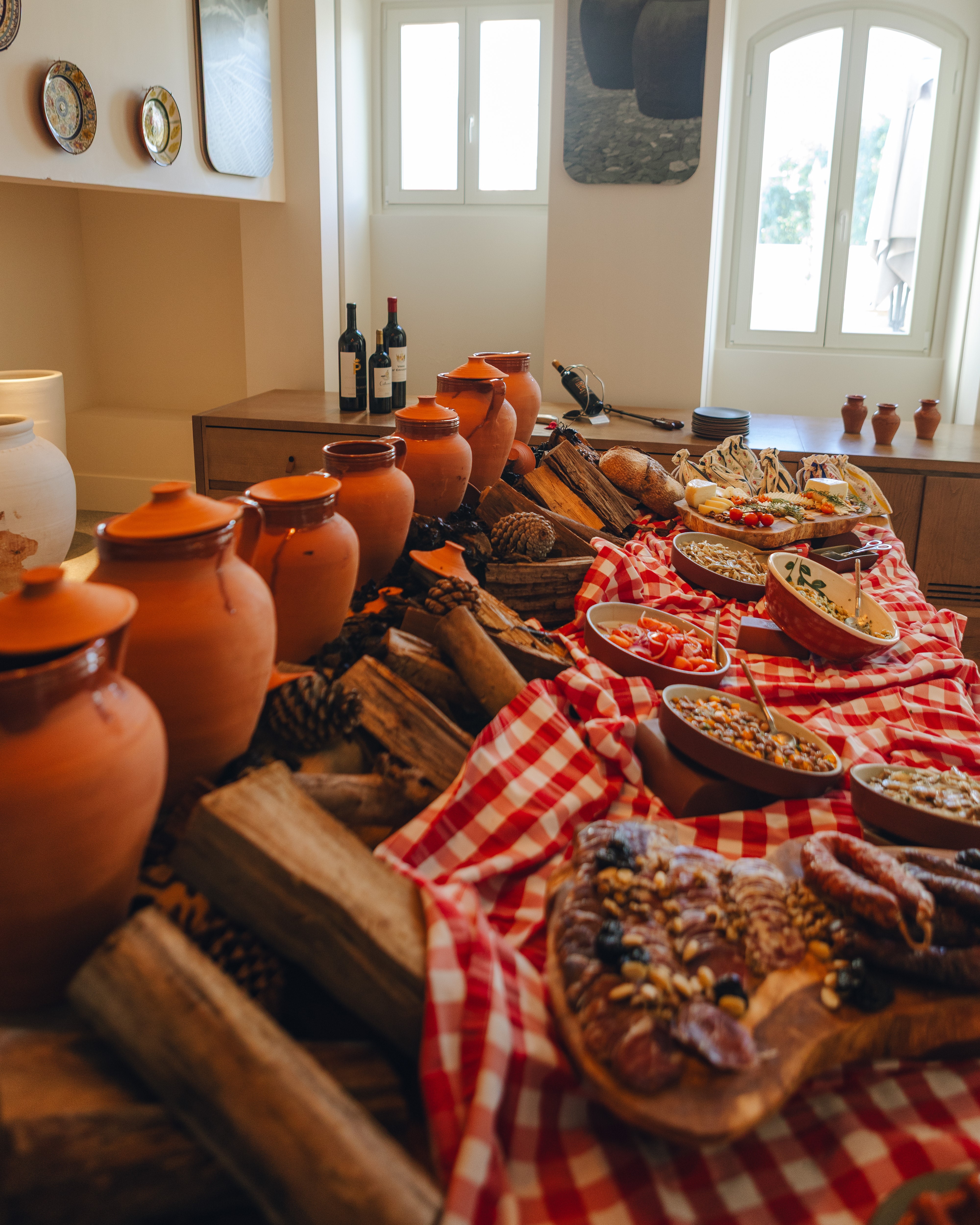 La comida comienza con una amplia mesa de entrantes, compuesta por ensaladas, embutidos, quesos regionales, pan alentejano y aceite de oliva. A continuación, llega el protagonista de este encuentro de sabores y aromas reconfortantes: el tradicional Cocido de Grão, servido en ollas de barro acompañado de verduras y carnes dispuestas en la mesa, fomentando la convivencia y el ritmo pausado que define los almuerzos de invierno en el campo.